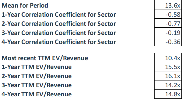For instance, I have pulled the EV/Revenue multiple for Adobe, Atlassian and Salesforce from 2014 to 2022. The "current" EV/Revenue of Salesforce is 10.4x at the end of December 2022. If we want to estimate the EV/Revenue in four years, we will calculate the four-year correlation coefficient (-0.36) and the mean EV/Revenue (13.6x) for this limited basket of software stocks. Plugging those numbers in we would get: