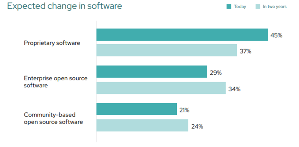 - In 2022, Red Hat’s “The State of Enterprise Open Source” reports that OSS will gain 8% in an organization’s share of type of software used. In addition, 80% of IT leaders expect to increase their use of enterprise OSS for emerging technologies, including AI/ML, edge computing, containers, and serverless computing.