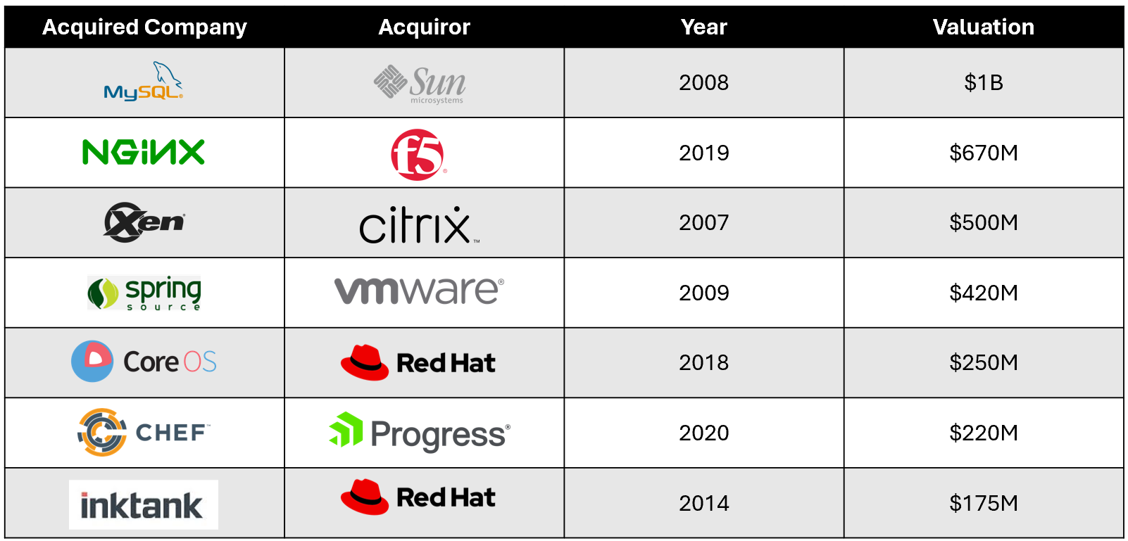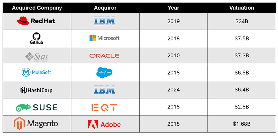 In addition, there are plenty of precedent transactions that highlight the critical role OSS plays in the technology landscape as major tech companies integrate these open source solutions into their broader business models.